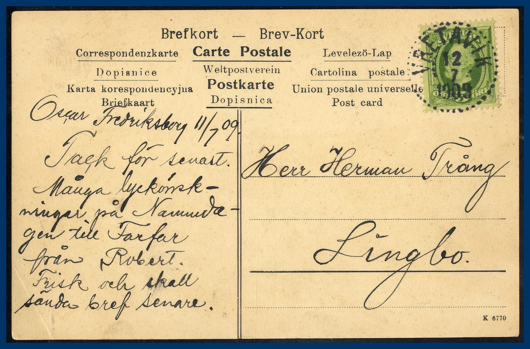 739.VRETAVIK (B) 1909-07-12 N33 Postal 250 kr (vykortet har