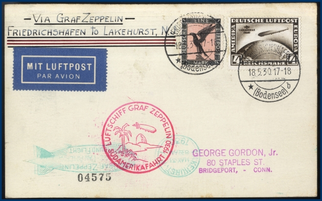 382. Zeppelinkort 1930 frankerat med 1 mk svart/rosa och 4 mark